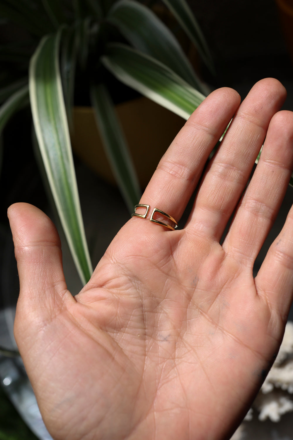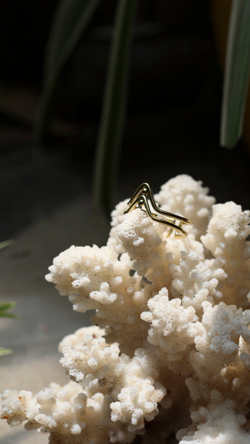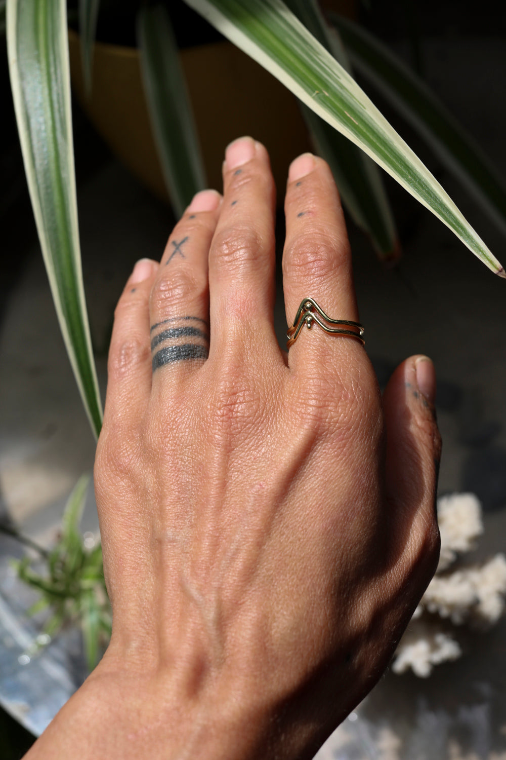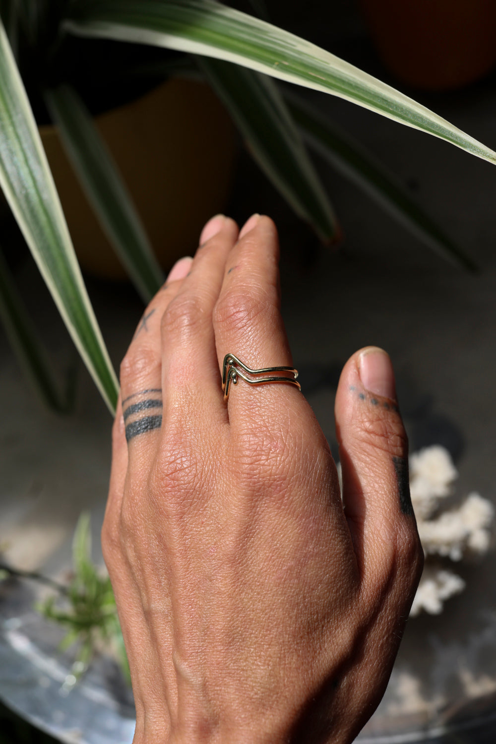 This delicate double-chevron brass ring features sleek lines and a subtle dot detail, creating a modern yet timeless silhouette. Lightweight and stackable, it's perfect for everyday wear — elegant on its own or layered with other favorites.