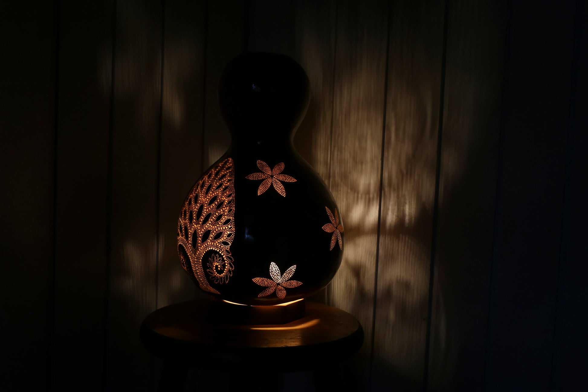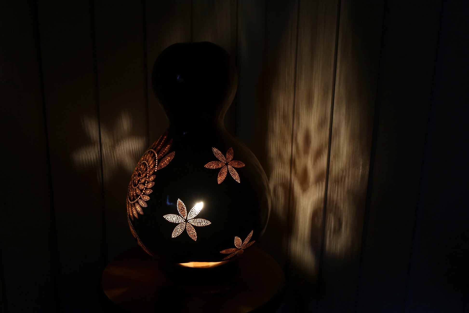 Discover the warmth of this handcrafted gourd lamp, a natural lighting solution that adds character to any room.