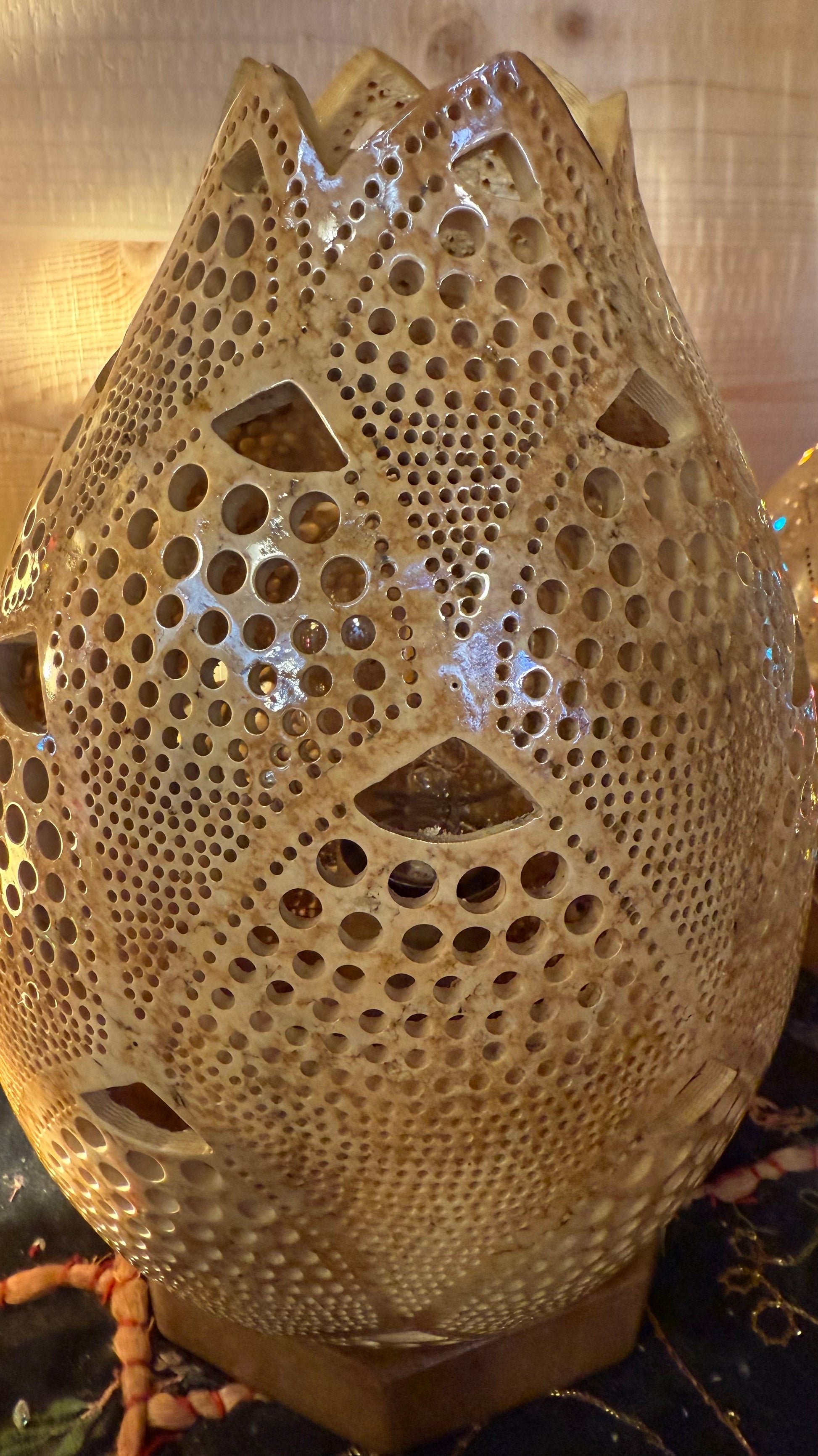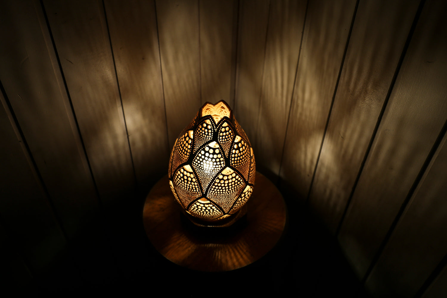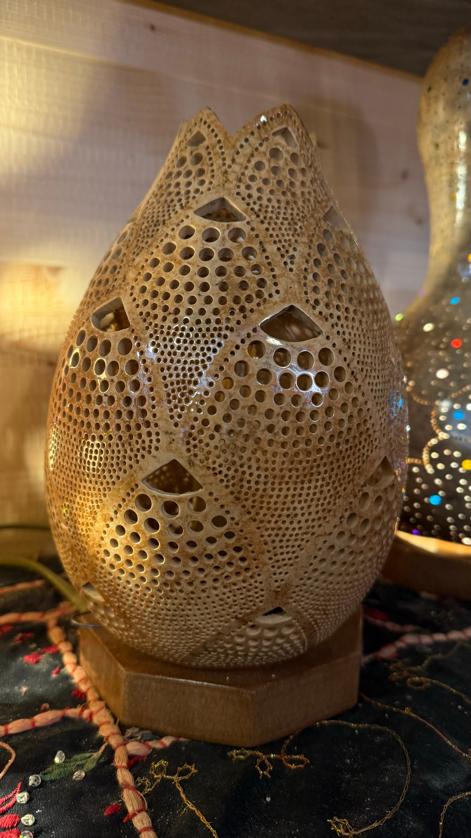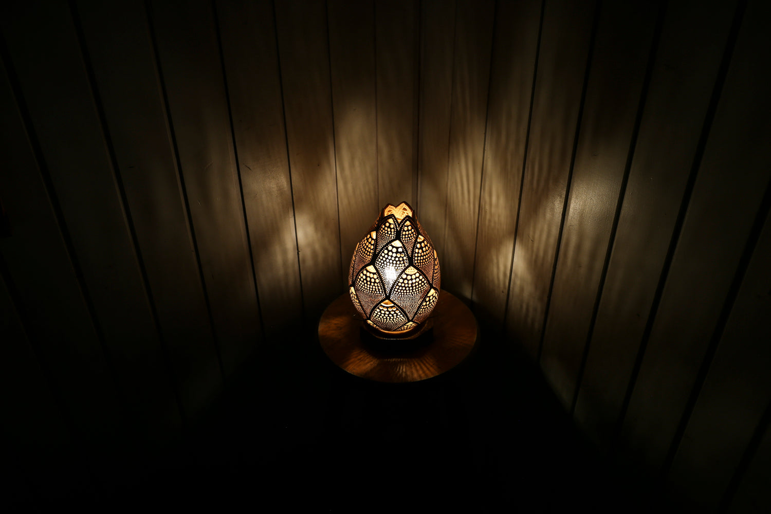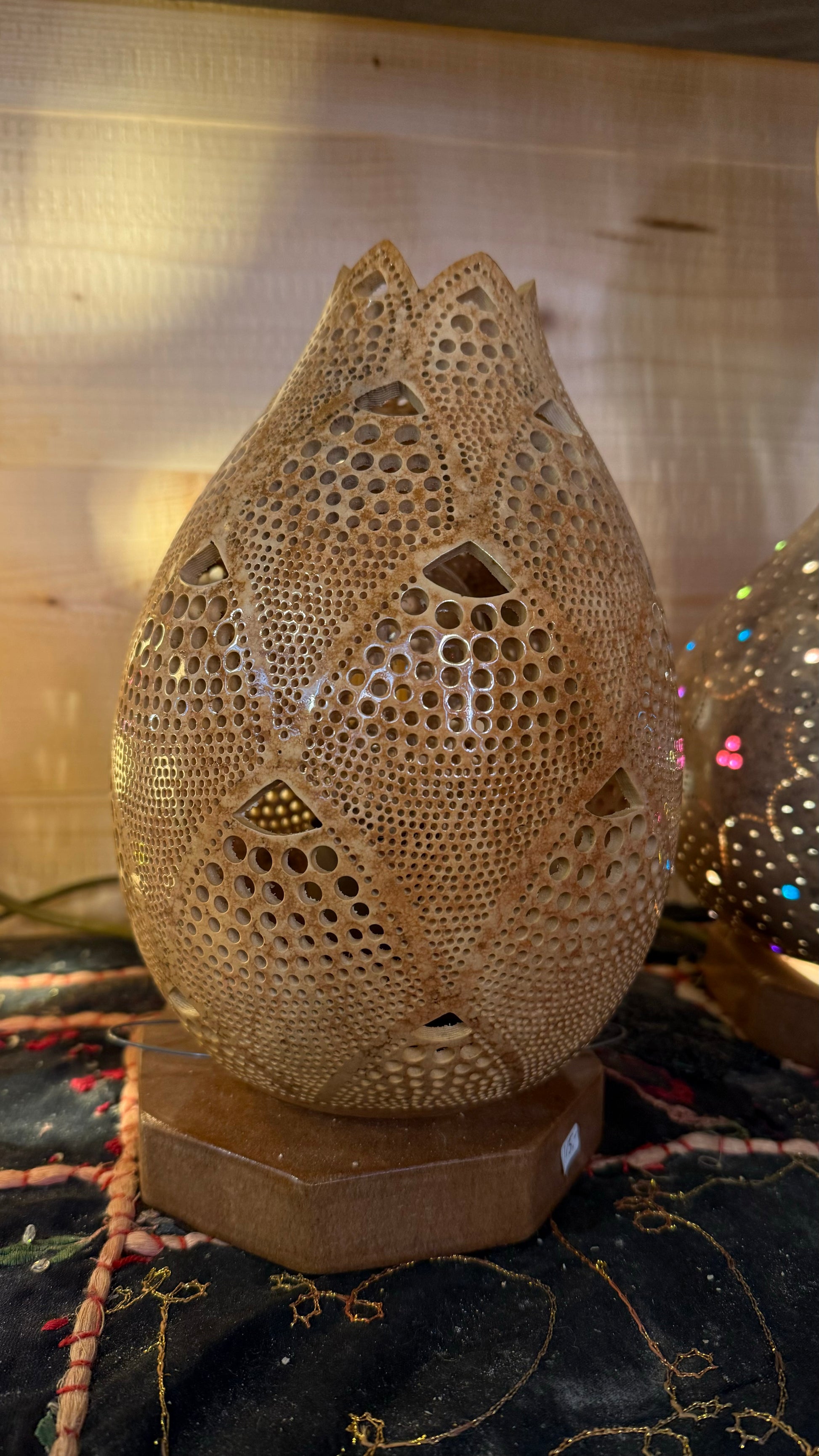 Handcrafted in Bodrum, this lamp features intricate patterns that cast a mesmerizing glow.