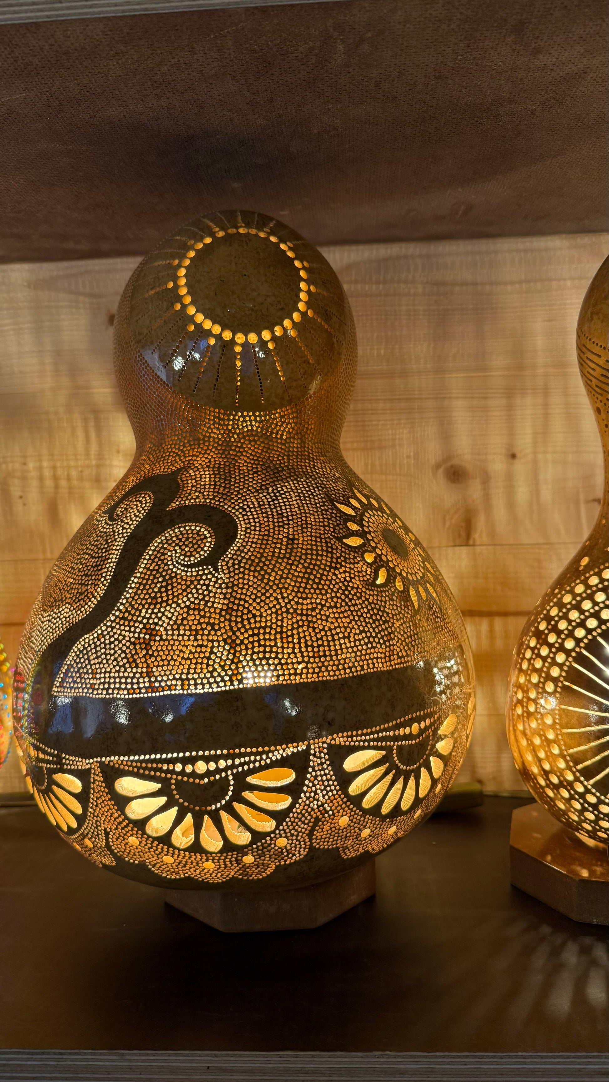 Transform your space with the warm glow of handmade gourd lamps, crafted by artisans in Bodrum.