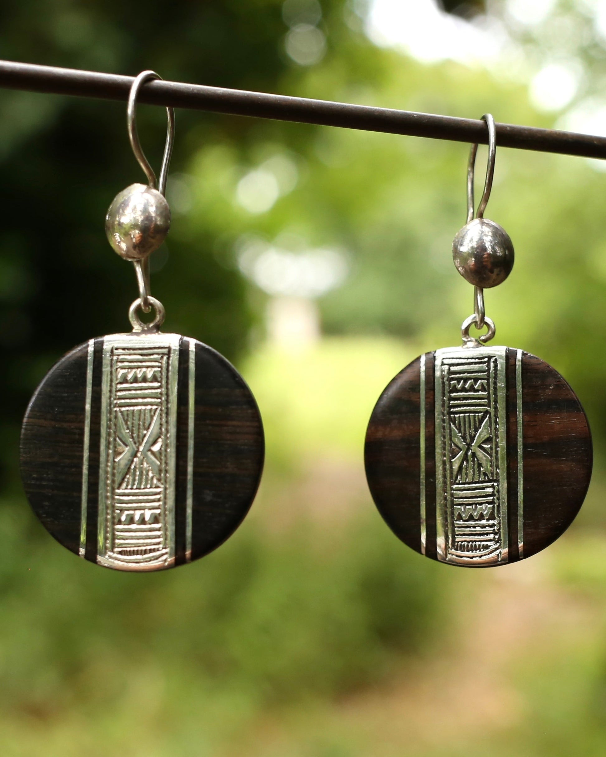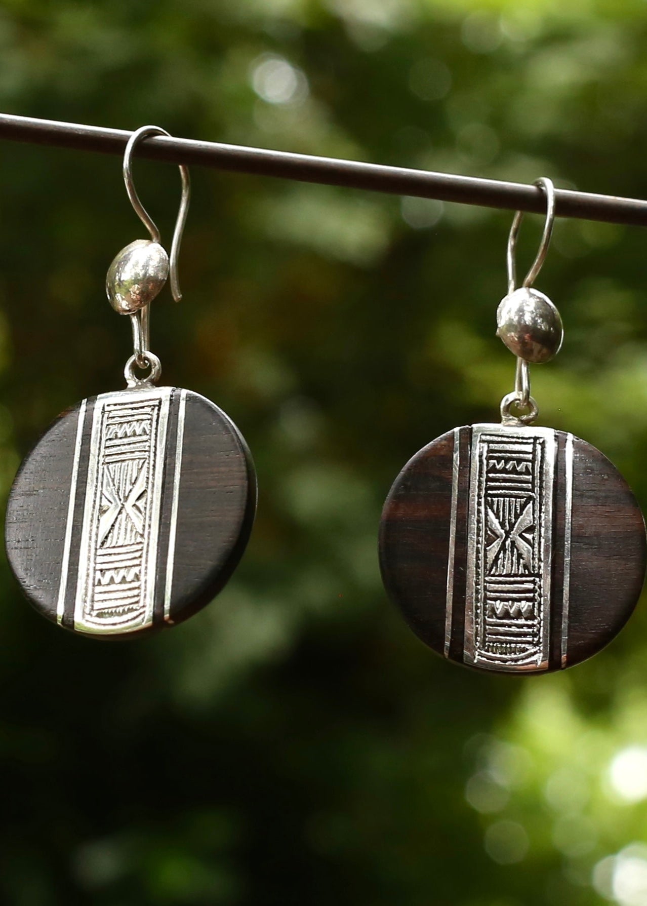 Crafted by artisans in Niger, these one-of-a-kind earrings combine polished ebony wood with engraved sterling silver. Lightweight, timeless, and rich in detail — each pair carries a story of traditional craftsmanship.