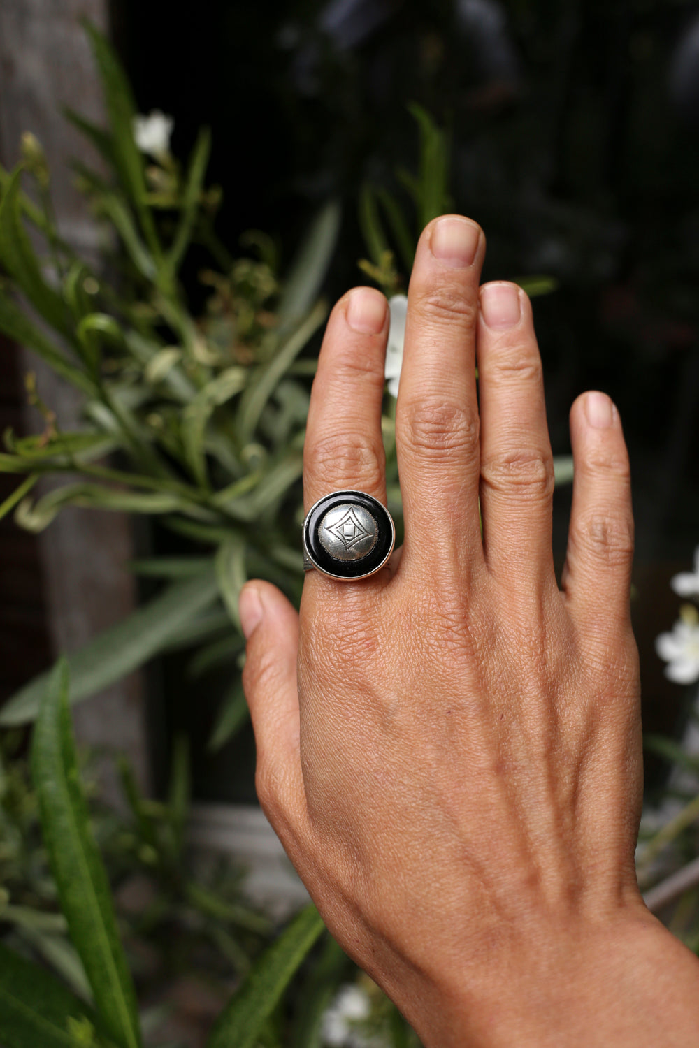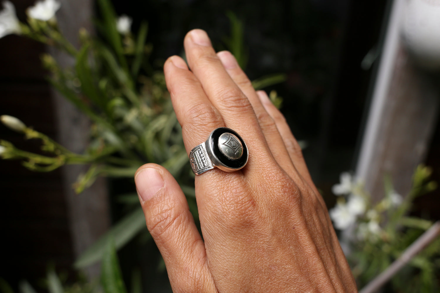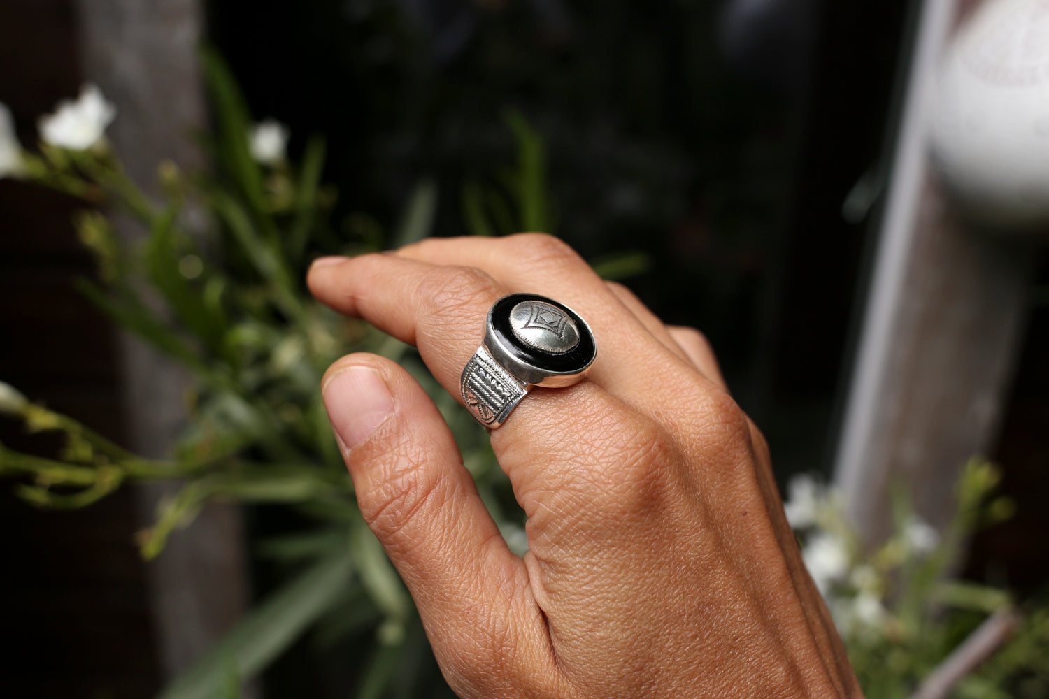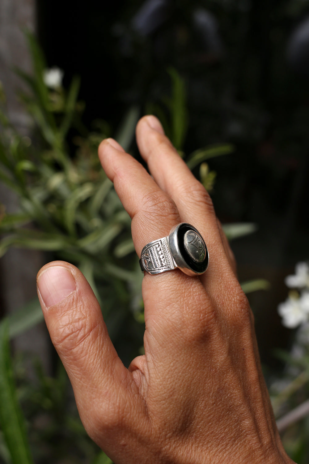 This unique silver and ebony ring is handcrafted by skilled artisans in Niger, blending powerful Onyx stone with the timeless shine of sterling silver. Each piece tells a story of tradition, craftsmanship, and cultural heritage.