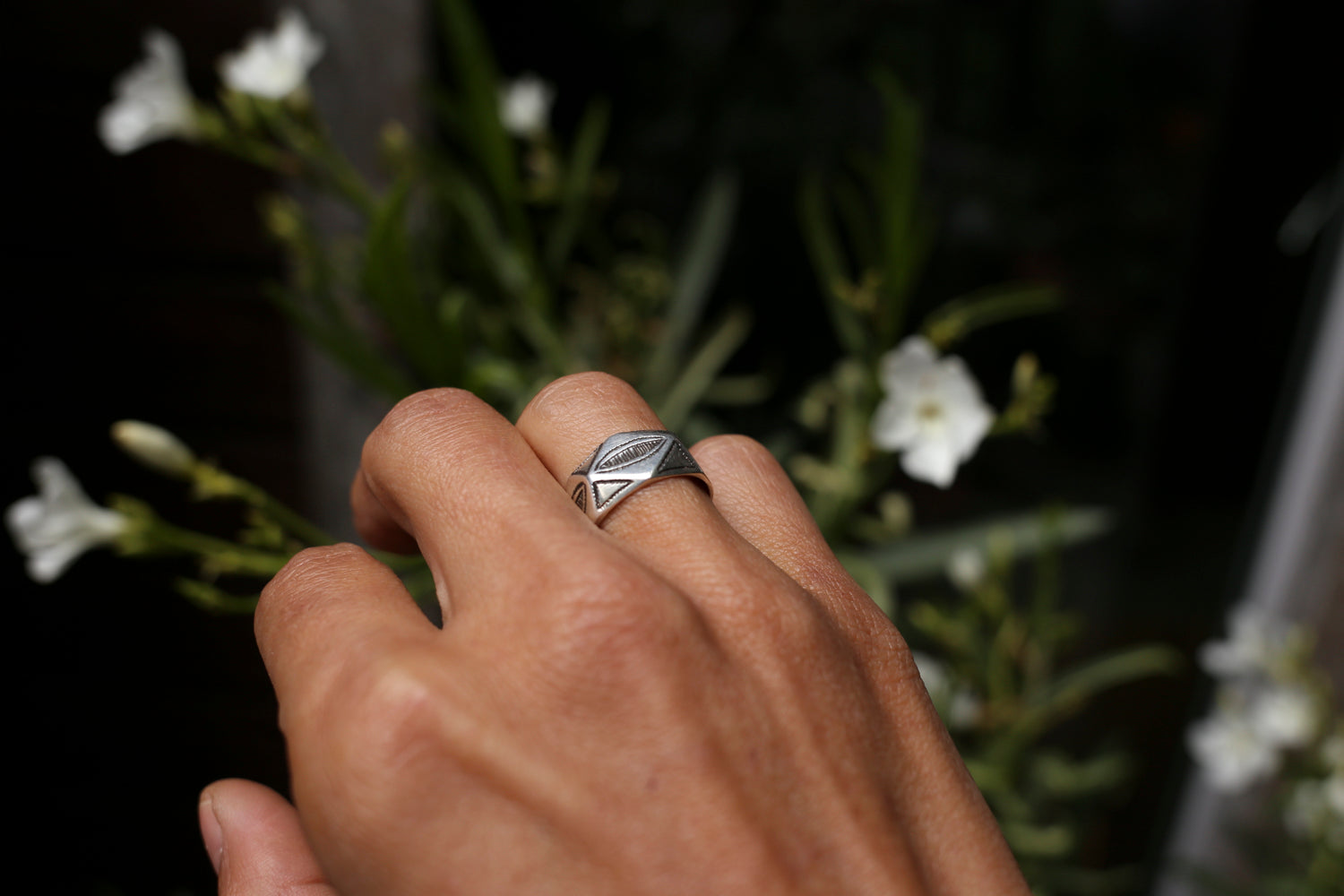 This bold silver tribal ring is handcrafted by master artisans in Niger, reflecting centuries-old African traditions. Its intricate, geometric design speaks to cultural identity and timeless strength.