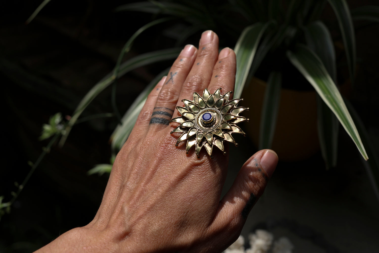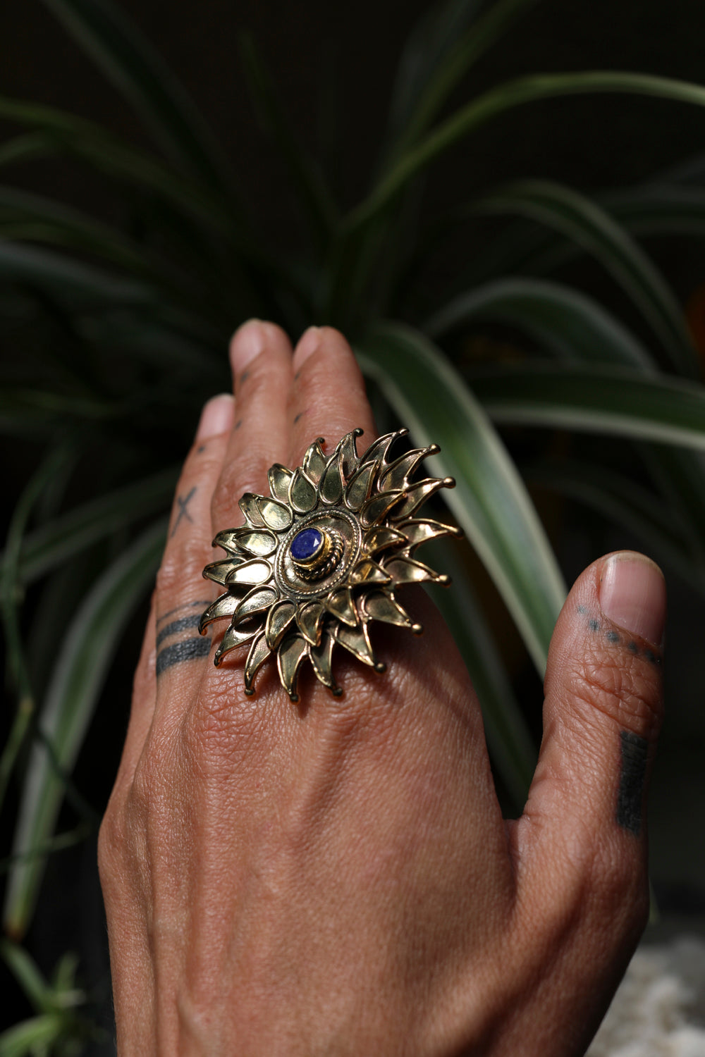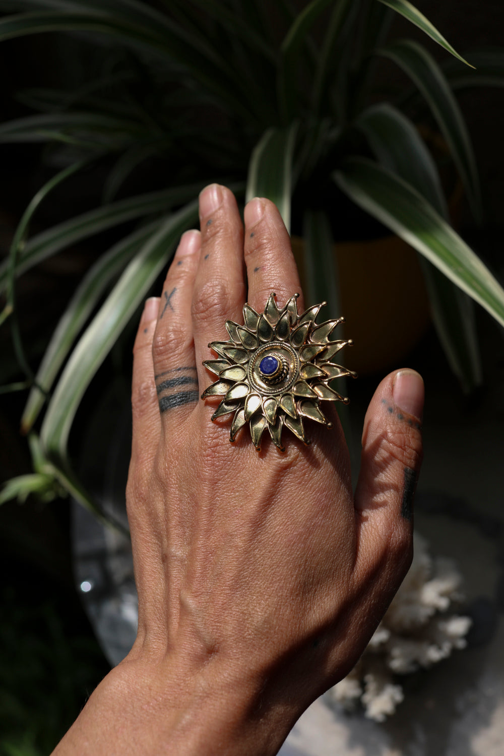 Shine bright with our sunburst brass ring, featuring a radiant floral design and deep blue center. Bold, symbolic, and full of fire, this statement piece captures the energy of light and strength — made to stand out and empower.