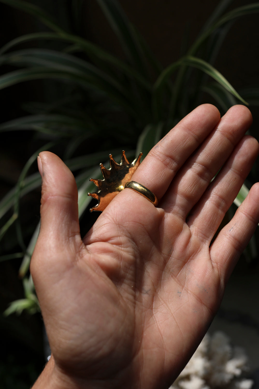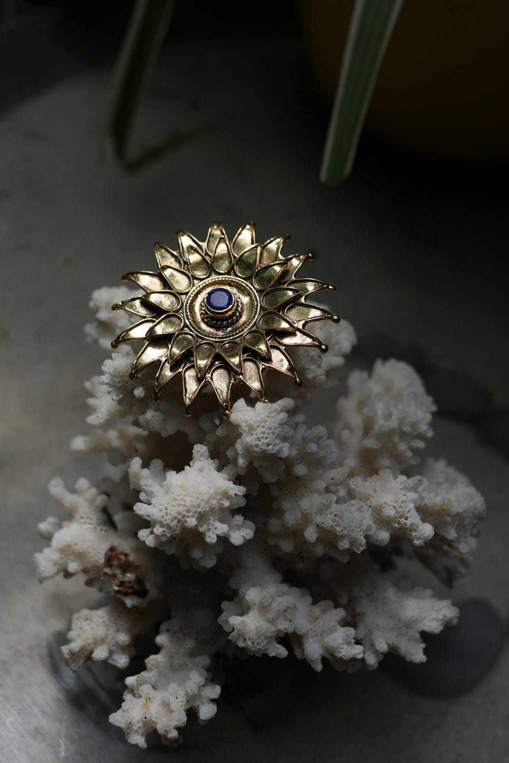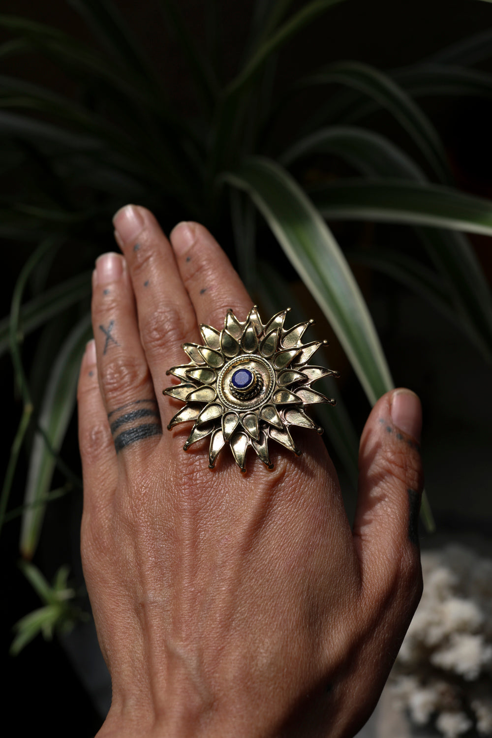 Shine bright with our sunburst brass ring, featuring a radiant floral design and deep blue center. Bold, symbolic, and full of fire, this statement piece captures the energy of light and strength — made to stand out and empower.